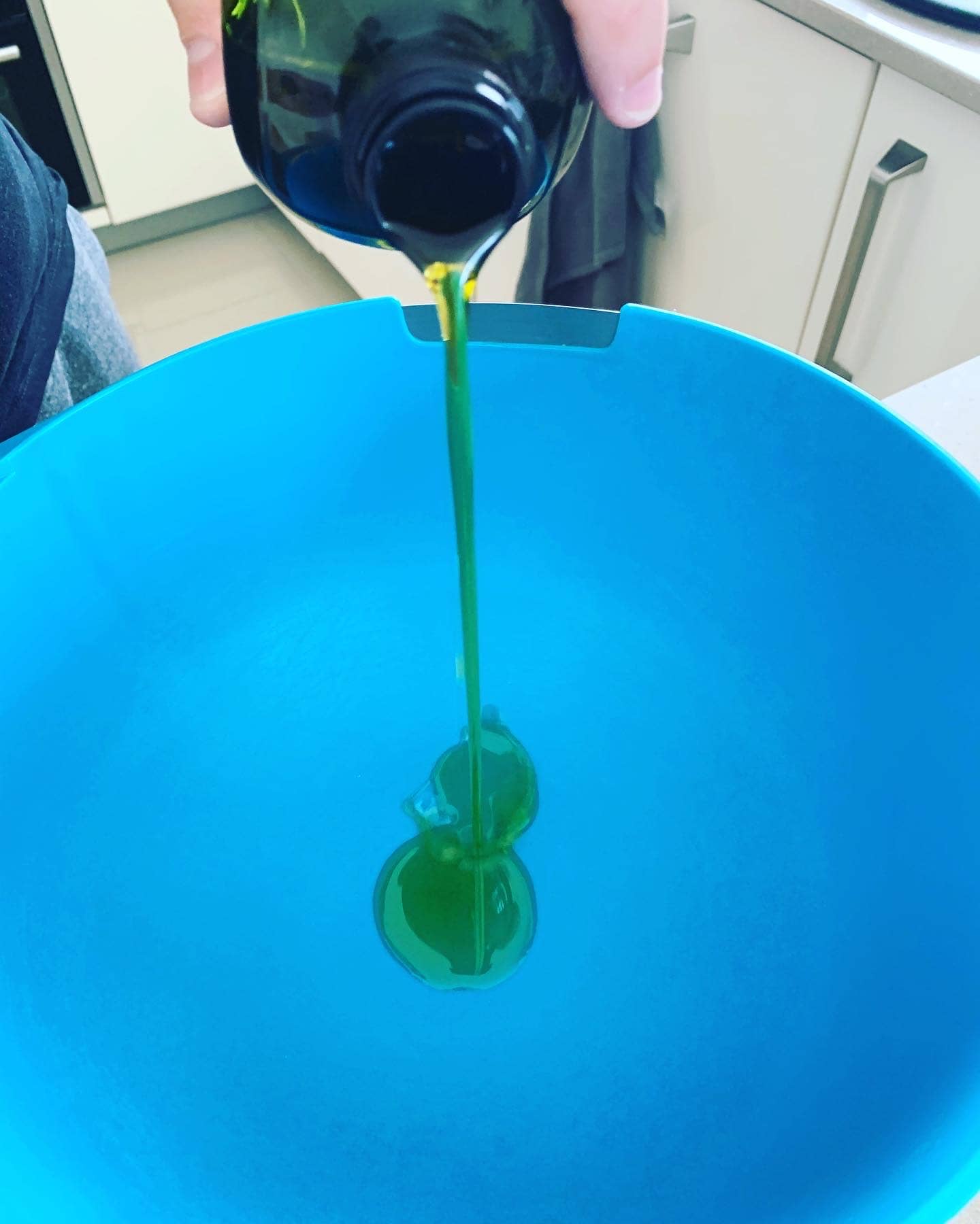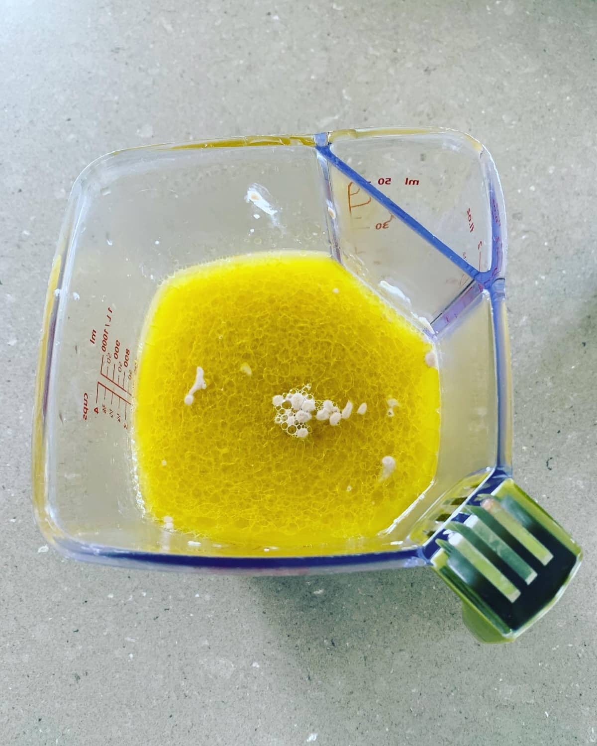 2. In a jug, mix the yeast, sugar and oil into 650ml of lukewarm water and leave for a few minutes