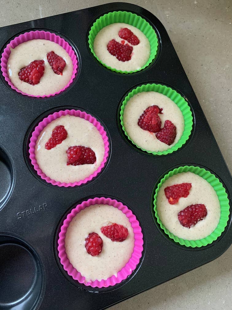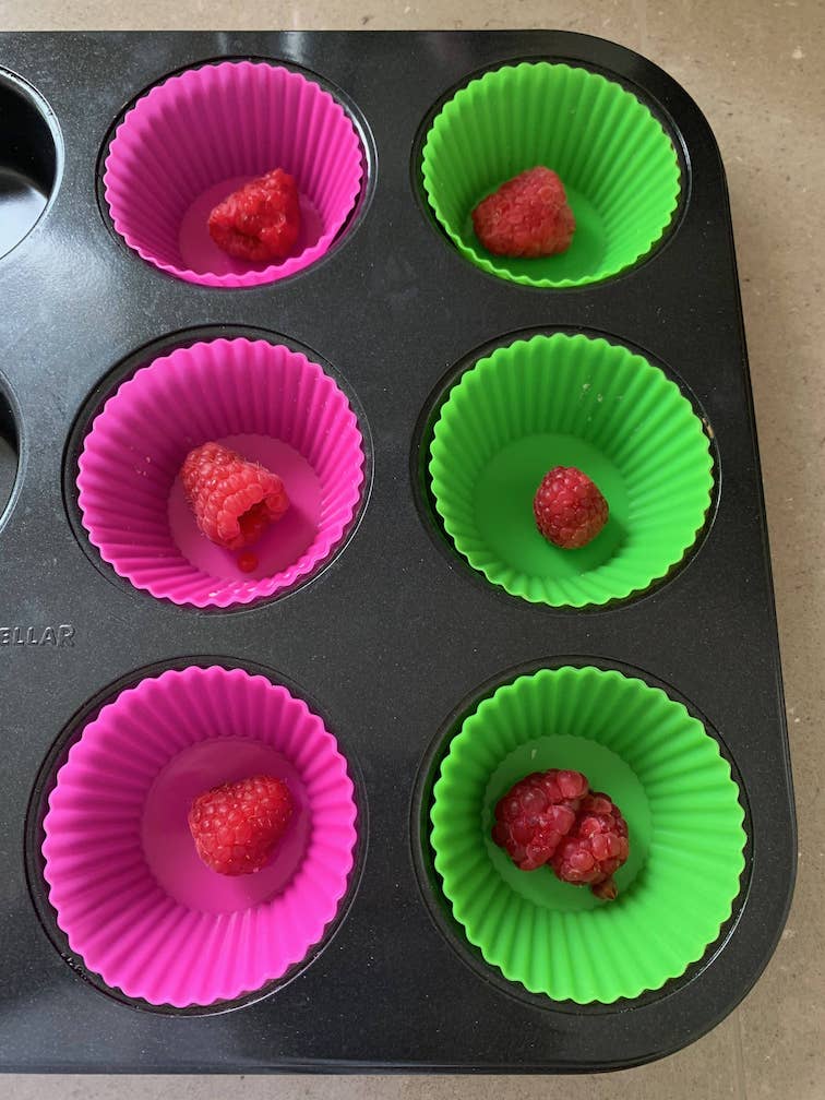 - Fill each case 3/4 of the way up, and add remaining raspberries on top