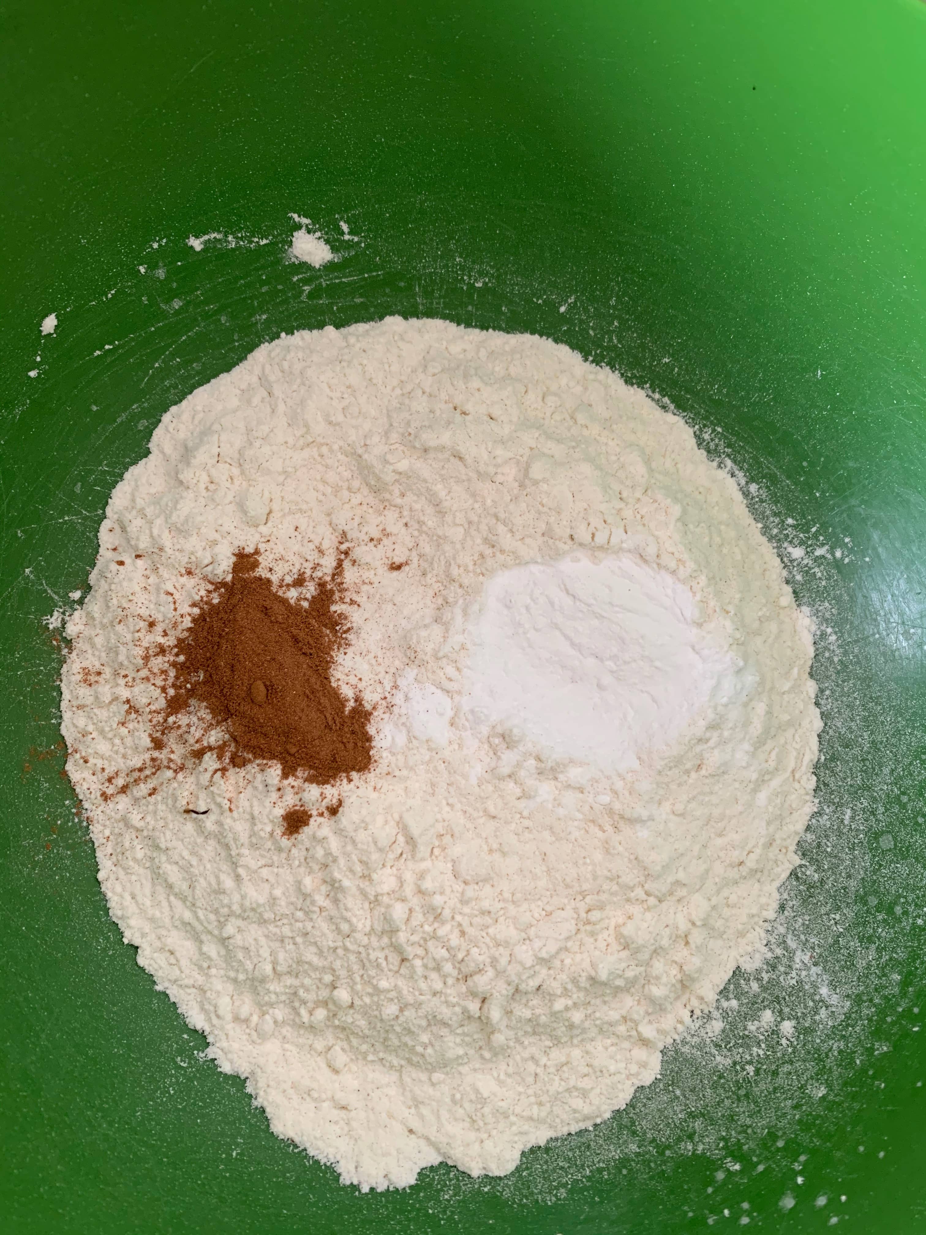 - Add baking powder and cinnamon to flour and mix