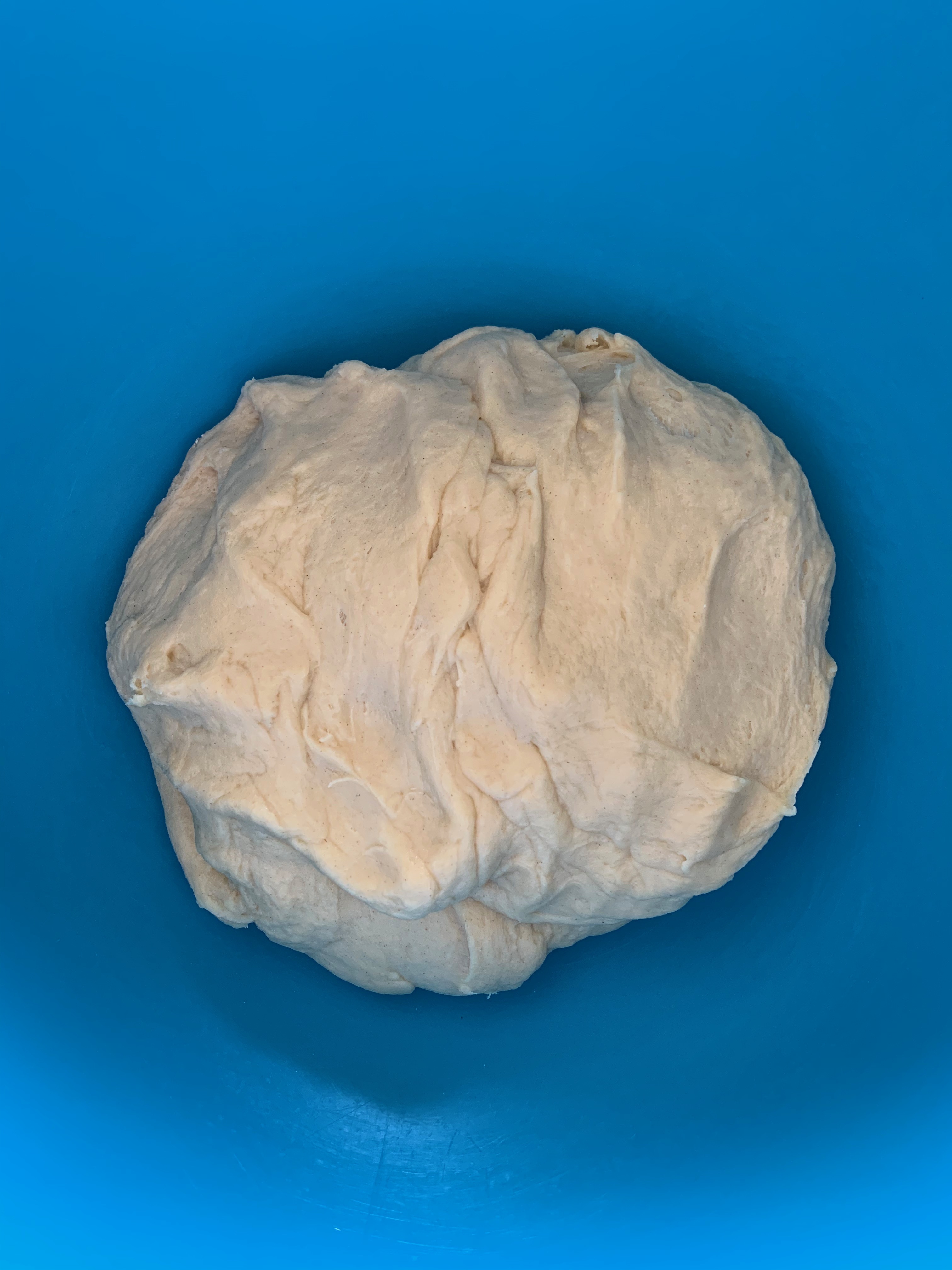 - Add the flour and salt- Use a dough hook, and mix on medium-low for 8 to 10 minutes or so. The dough should come away from the side of the bowl for the most part, and be sticky and soft. It will stay a bit tacky, that’s fine – you don’t want the buns to be dense.