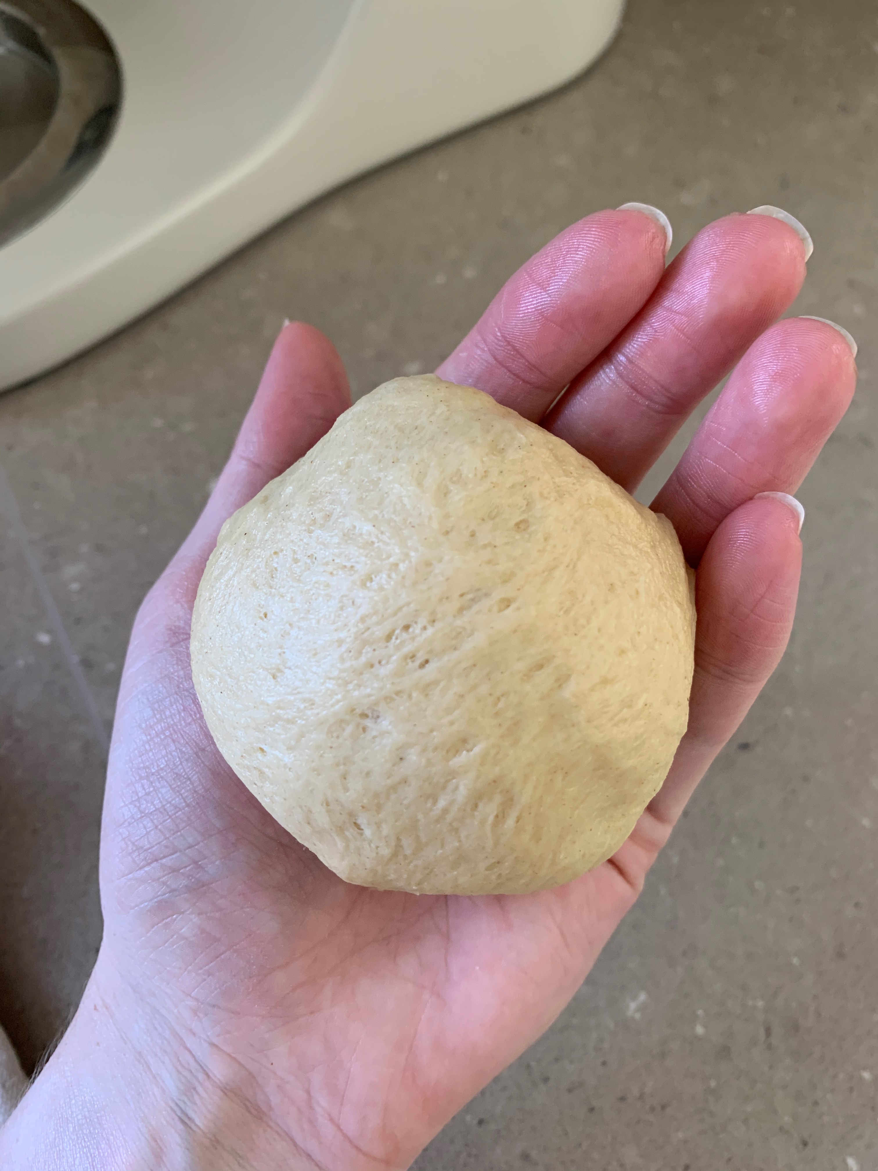 - Divide into 8 equal pieces- Shape each dough ball, by pinching the bottom of the dough ball together and then cupping your hand on top of it on the counter. Circle your hand over top of the ball, rolling the dough ball around gently until the top is smooth. Pinch together the bottom if needed and set on lined baking tray. Cover with a towel.