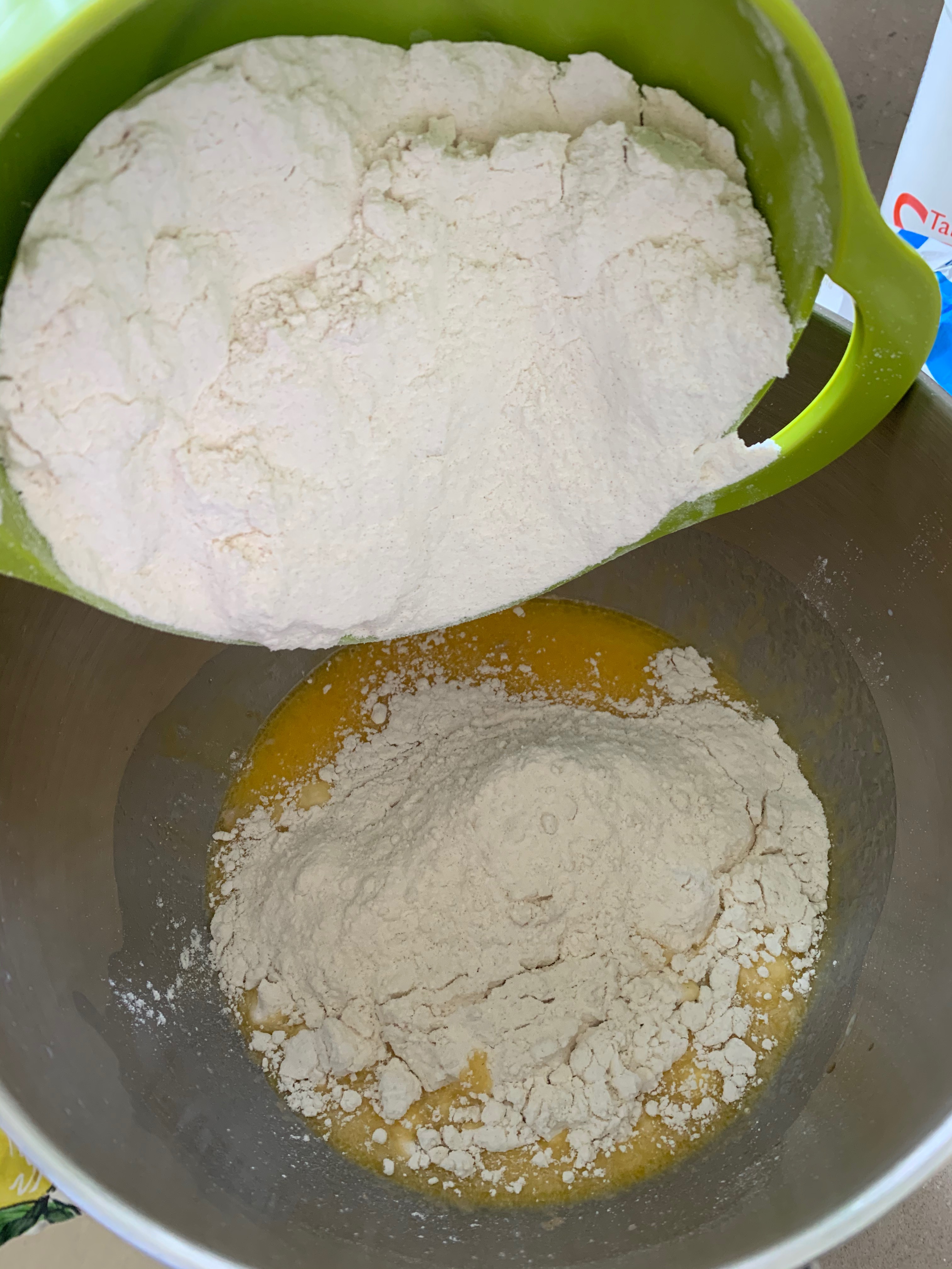 - Whisk together warm milk, melted butter, sugar and yeast.