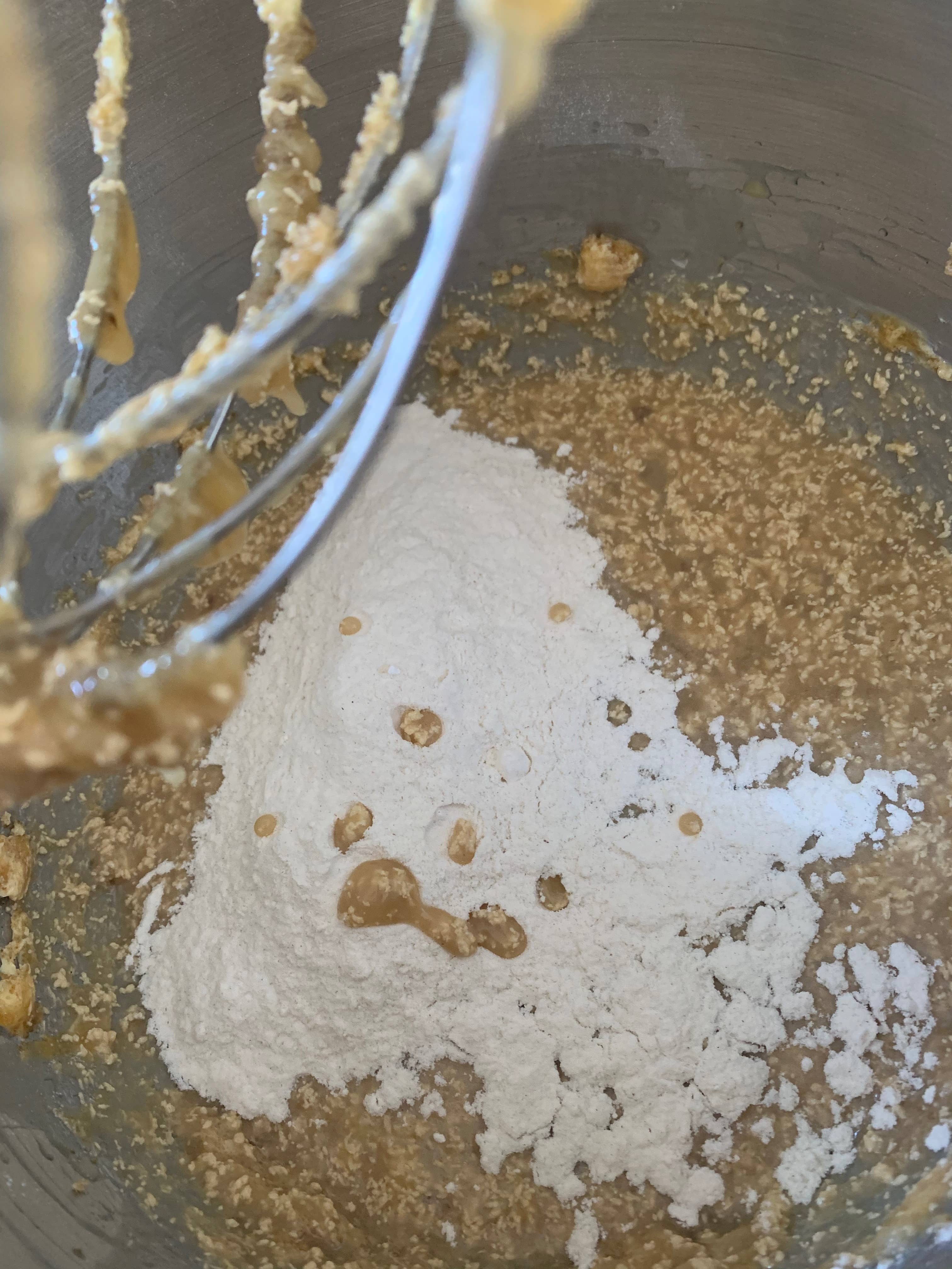- With the mixer running on low speed, slowly beat the dry ingredients into the wet ingredients until no flour pockets remain-Do not overmix.