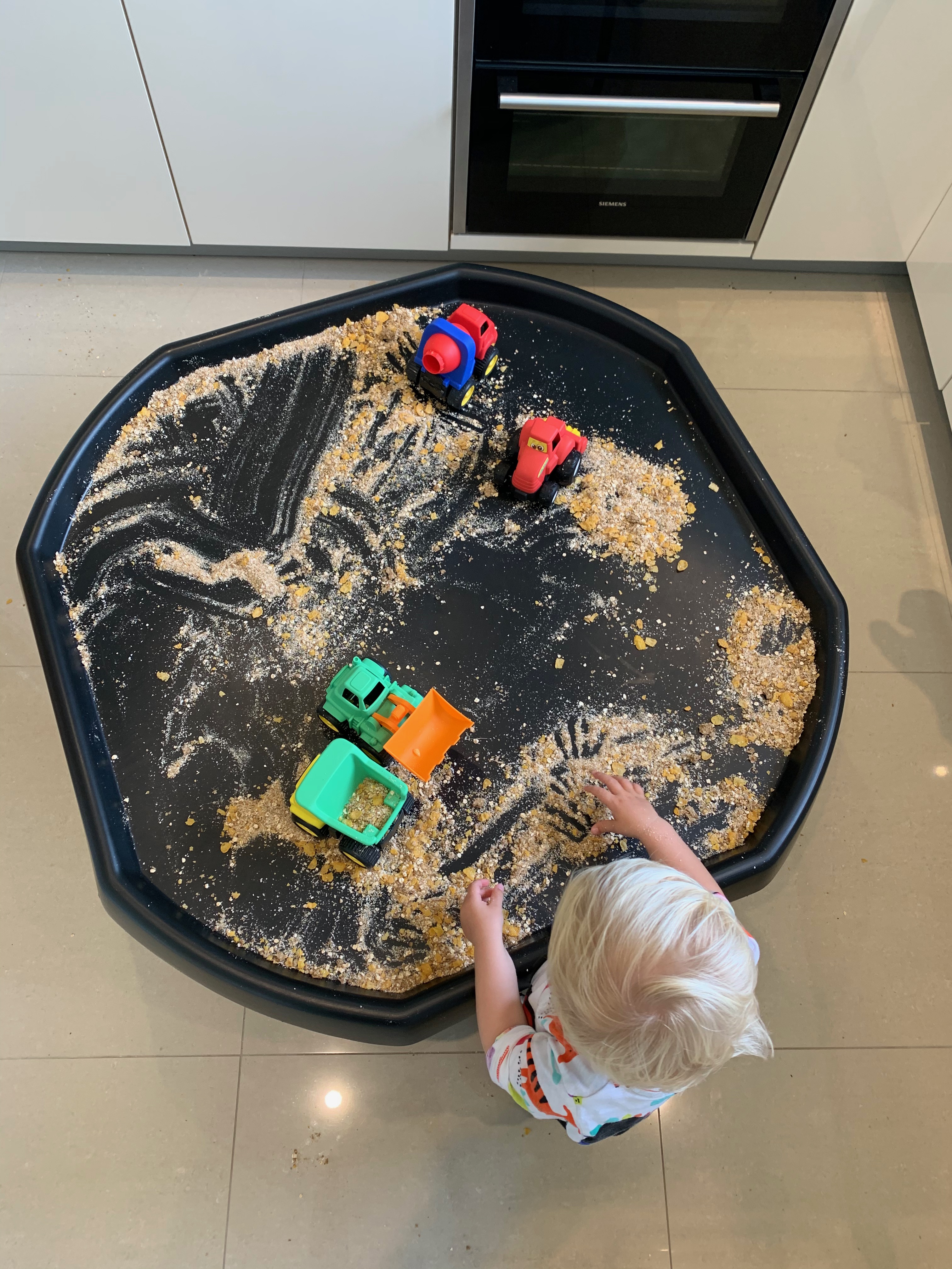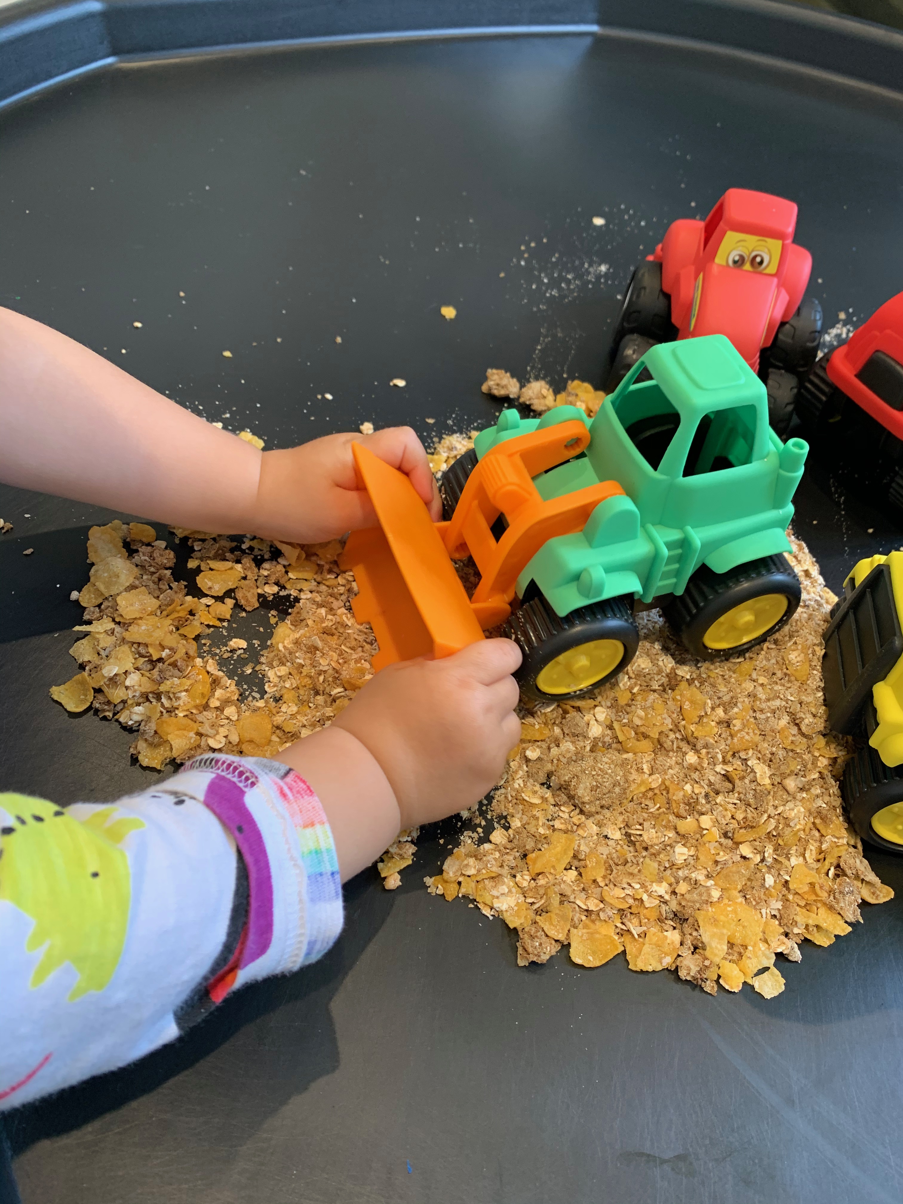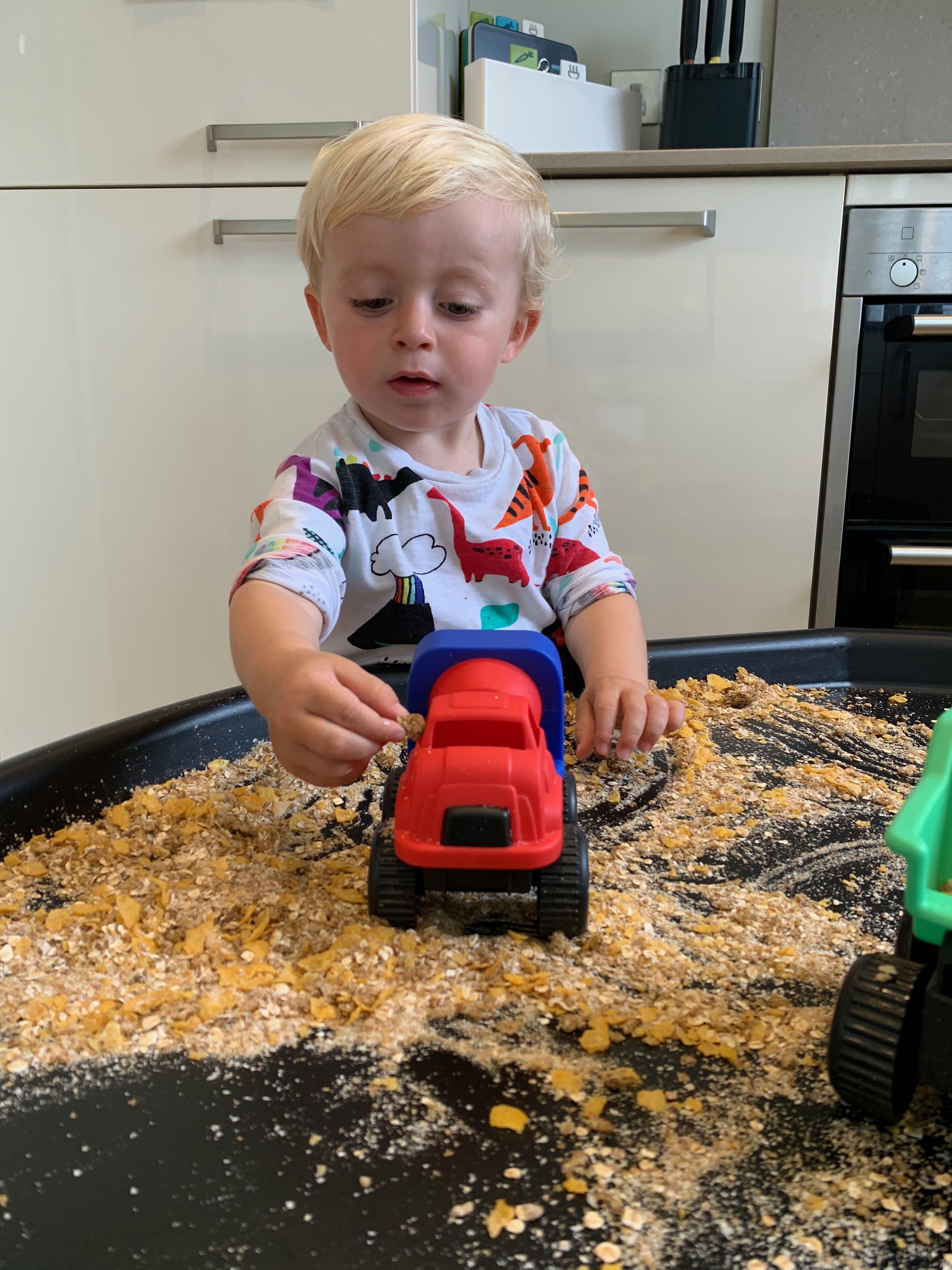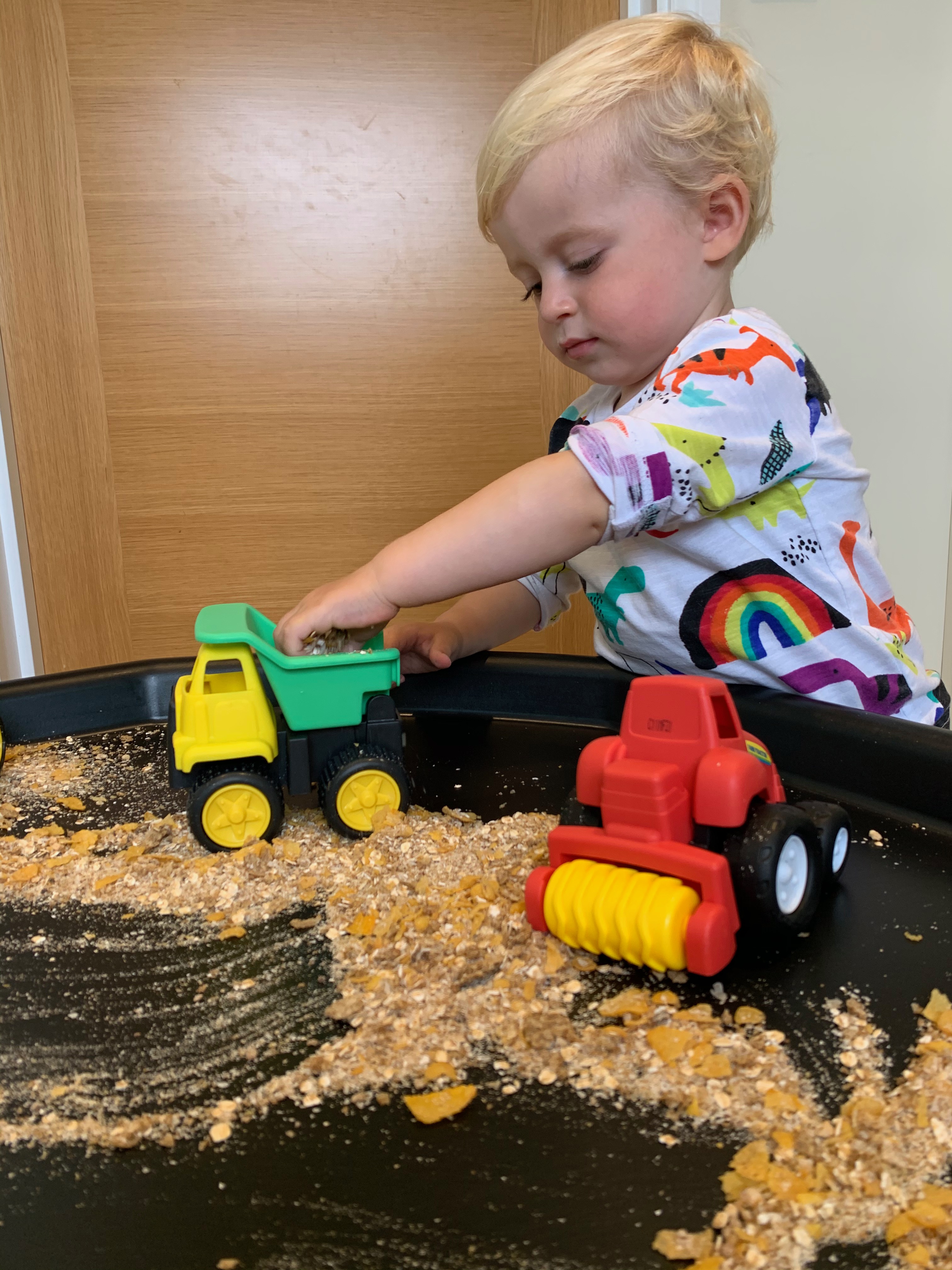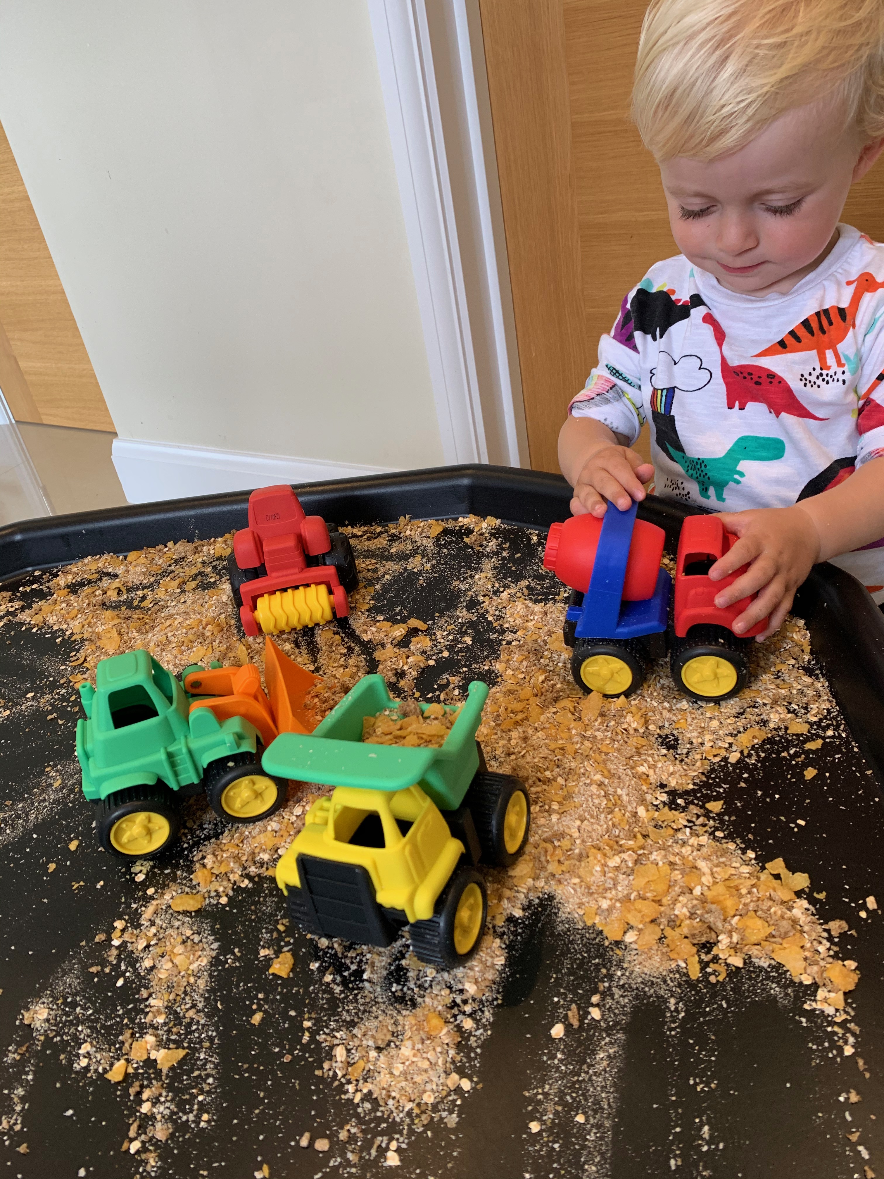 Harry spent AGES filling his trucks with handfuls of cereal, then emptying them, again and again, over and over! He loved the different mechanisms on each vehicle, exploring what they did and how they could carry/hold the cereal.