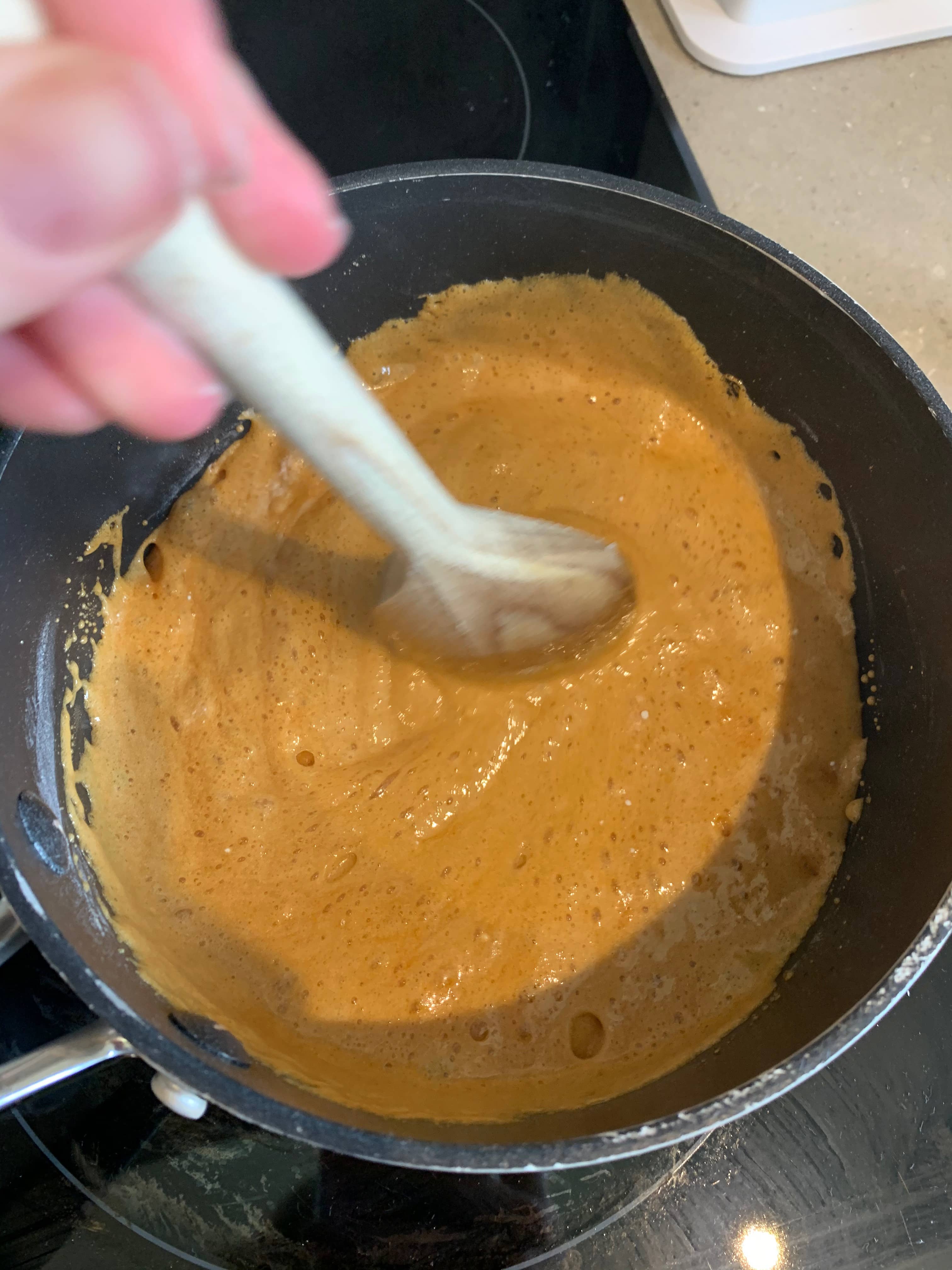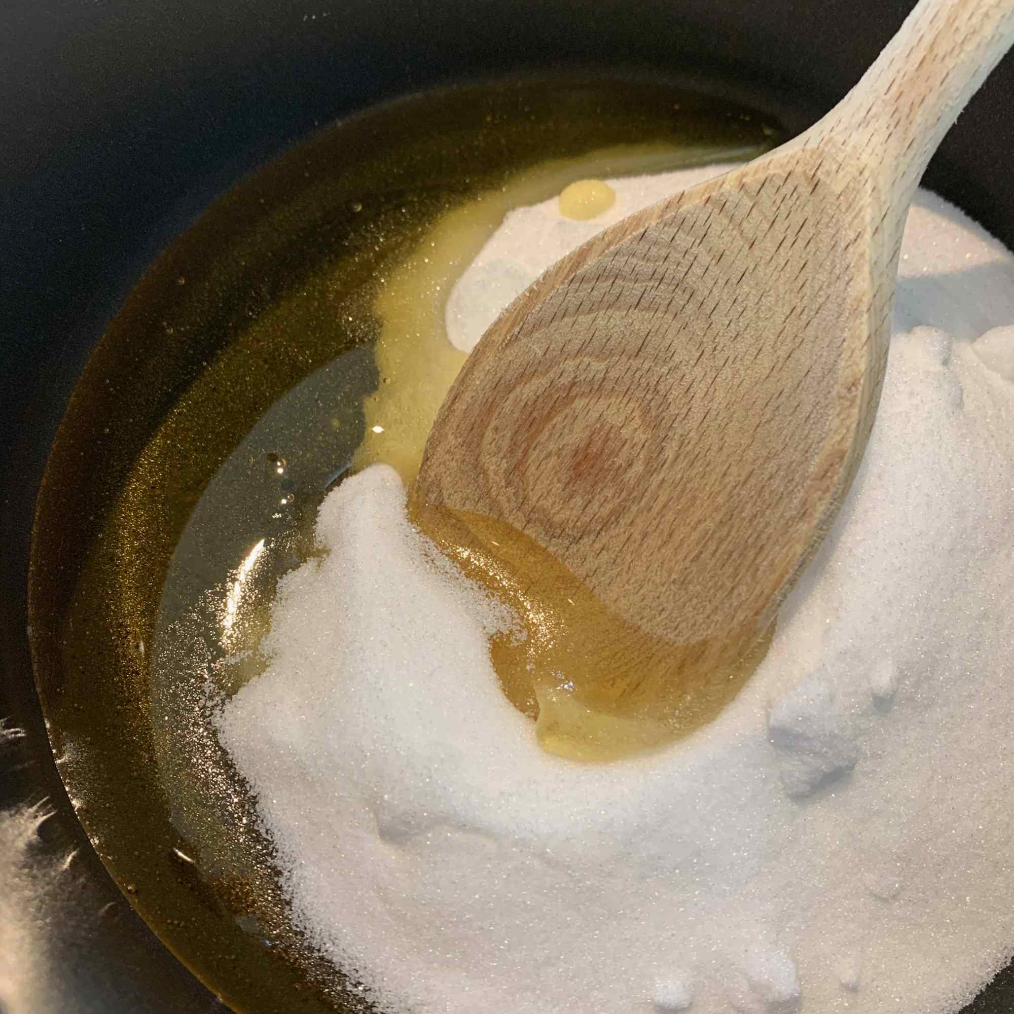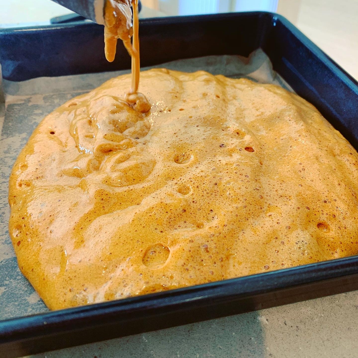 Once completely melted, turn up the heat a little and simmer until you have an amber coloured caramel (this won’t take long), then as quickly as you can, turn off the heat, tip in the bicarbonate of soda and beat in with a wooden spoon until it has all disappeared and the mixture is foaming.