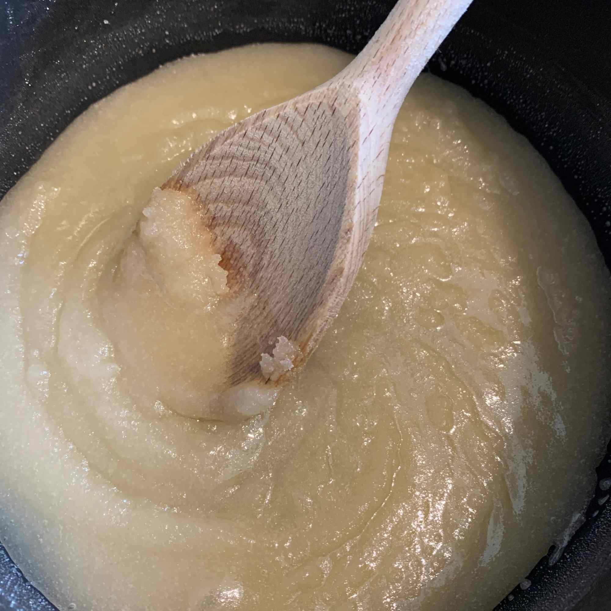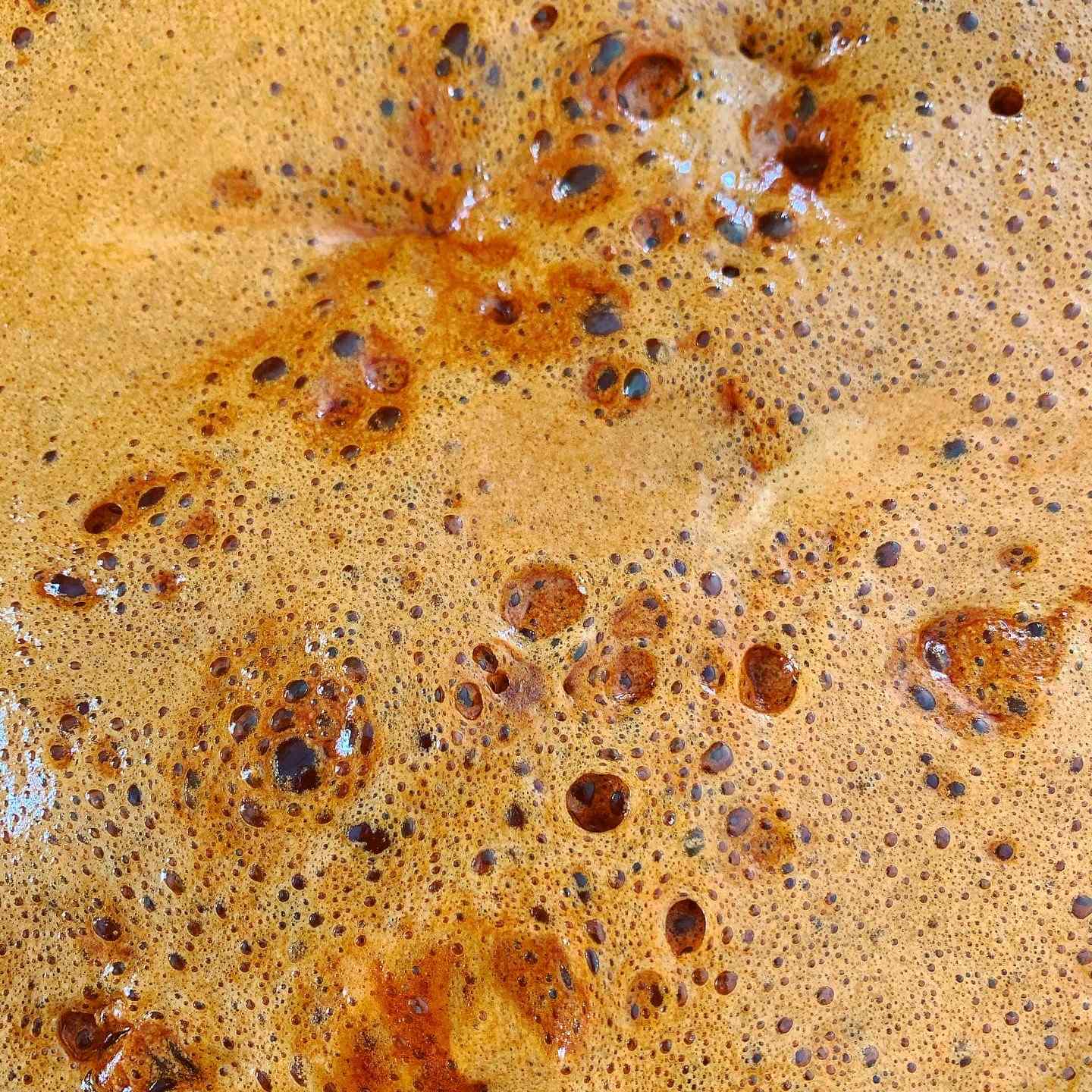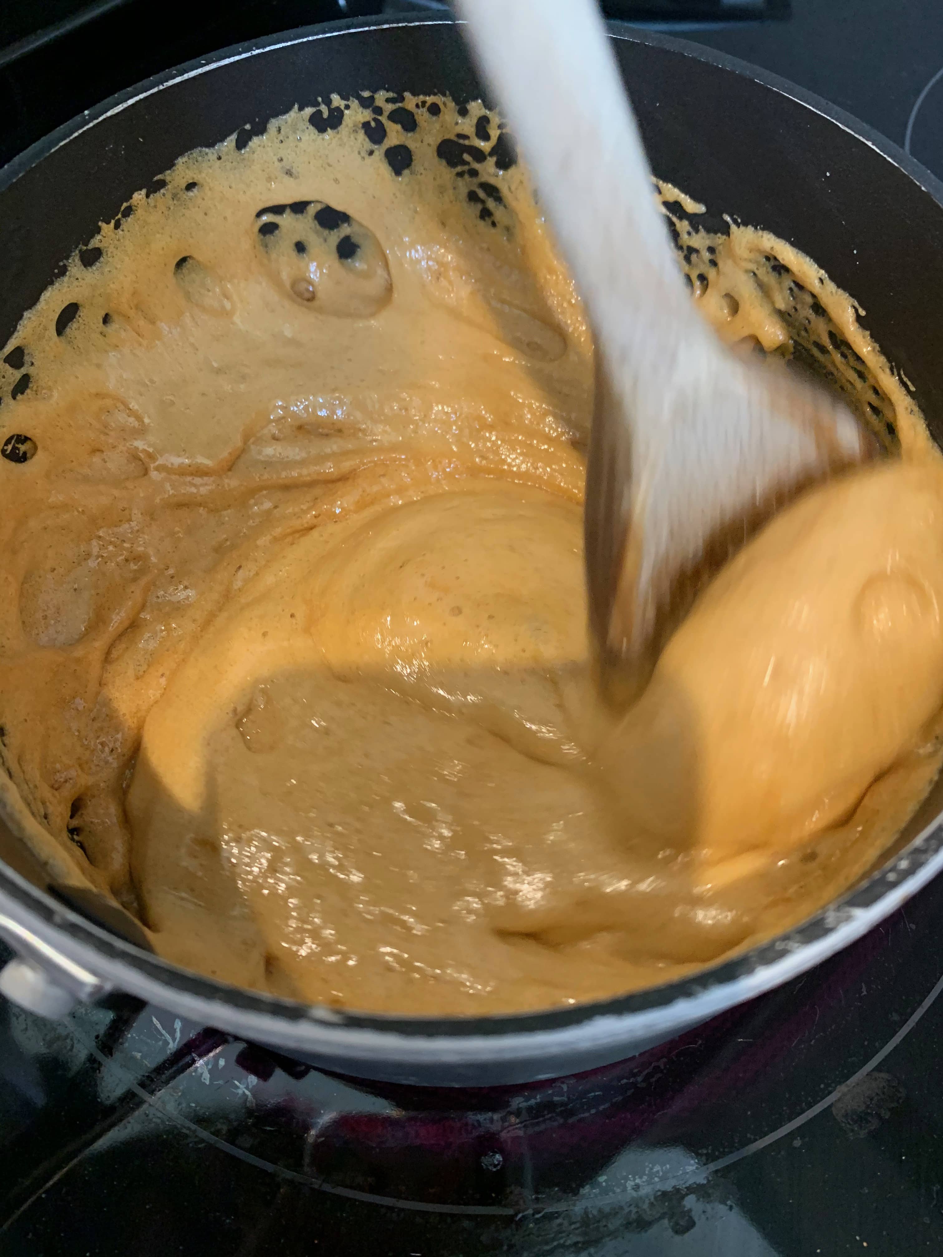 Once completely melted, turn up the heat a little and simmer until you have an amber coloured caramel (this won’t take long), then as quickly as you can, turn off the heat, tip in the bicarbonate of soda and beat in with a wooden spoon until it has all disappeared and the mixture is foaming.