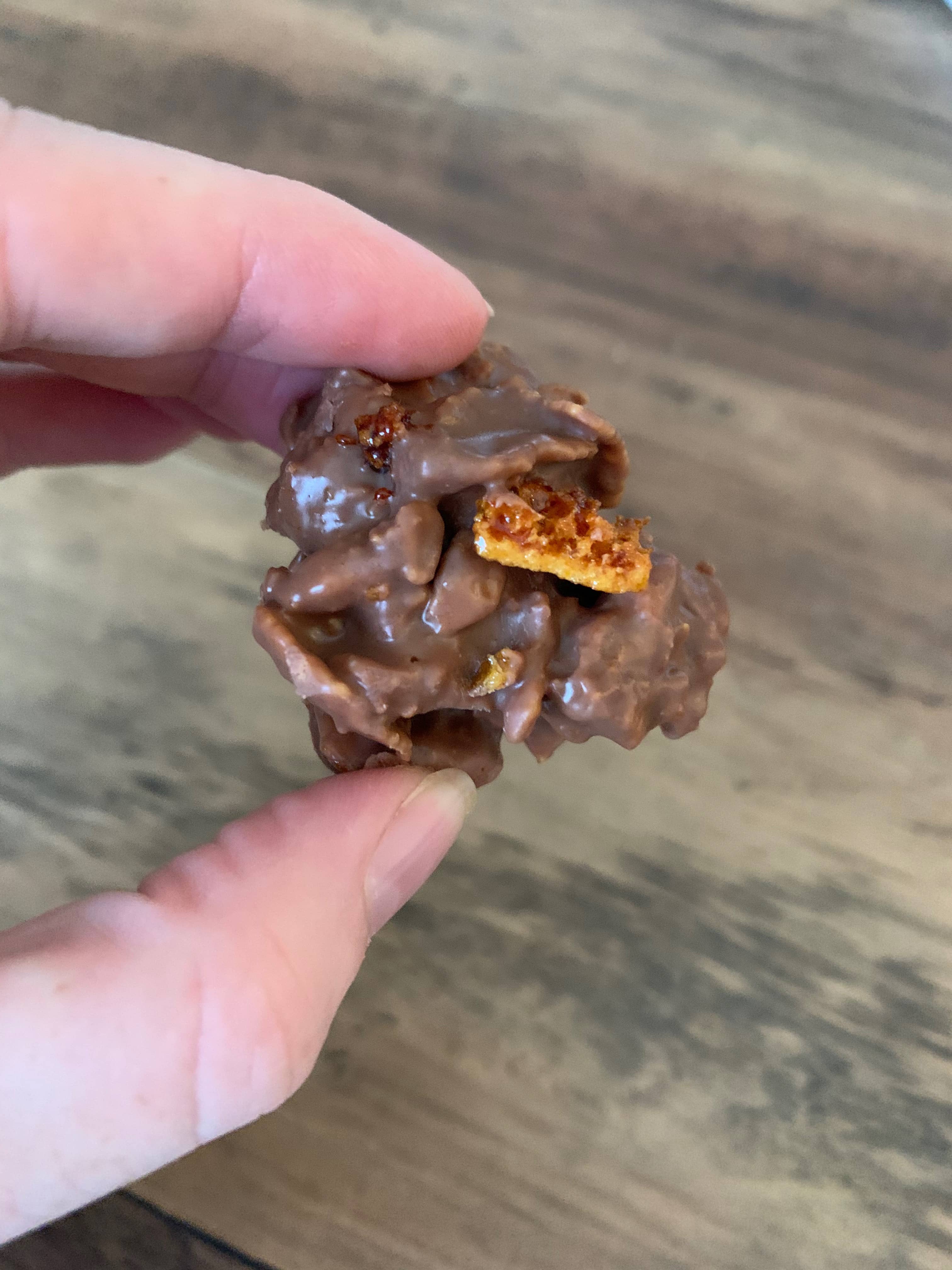 Carefully melt your chocolate in the mircowave (check regularly to avoid burning). Add cornflakes and small pieces of honeycomb to your melted chocolate and mix thoroughly. Make small clusters of your chocolatey mixture onto a nonstick surface and allow to set.