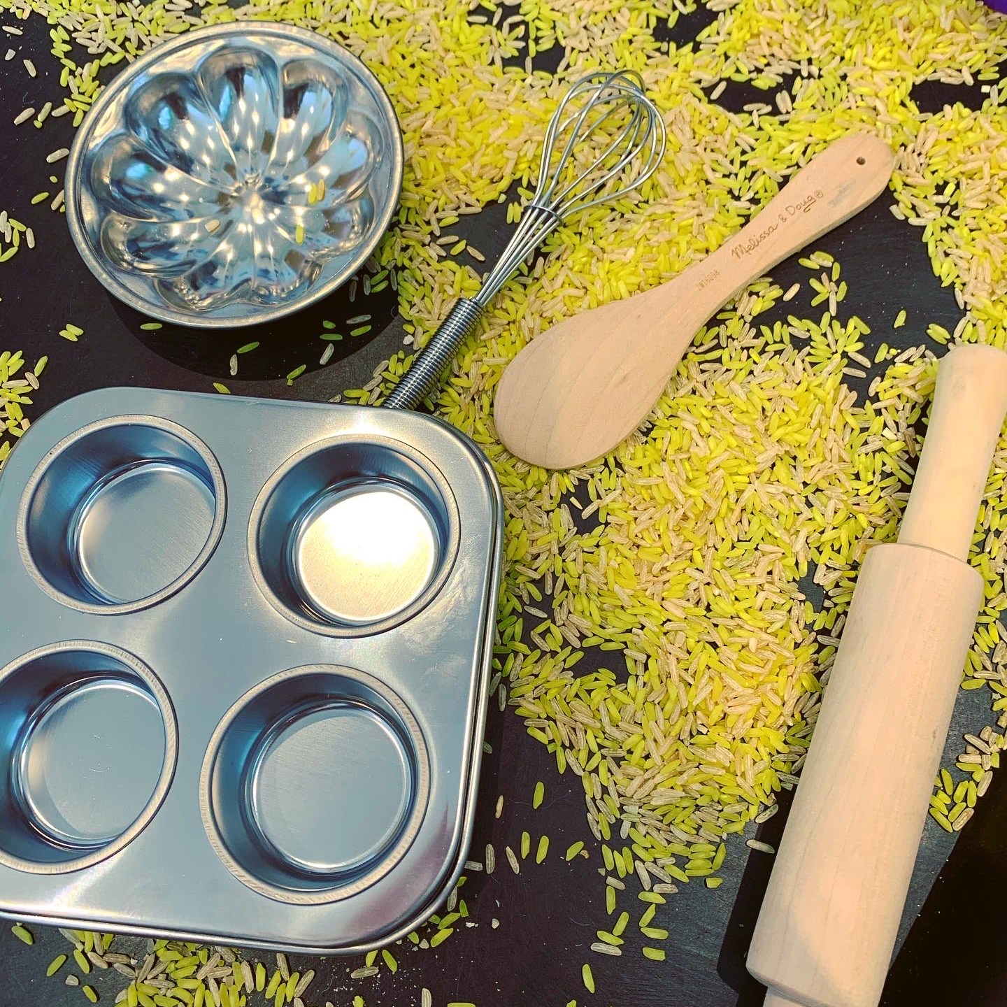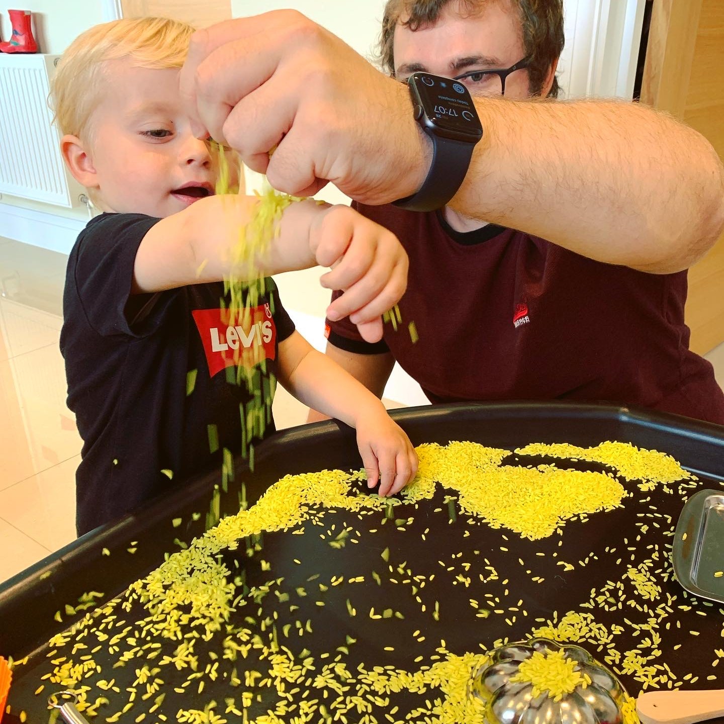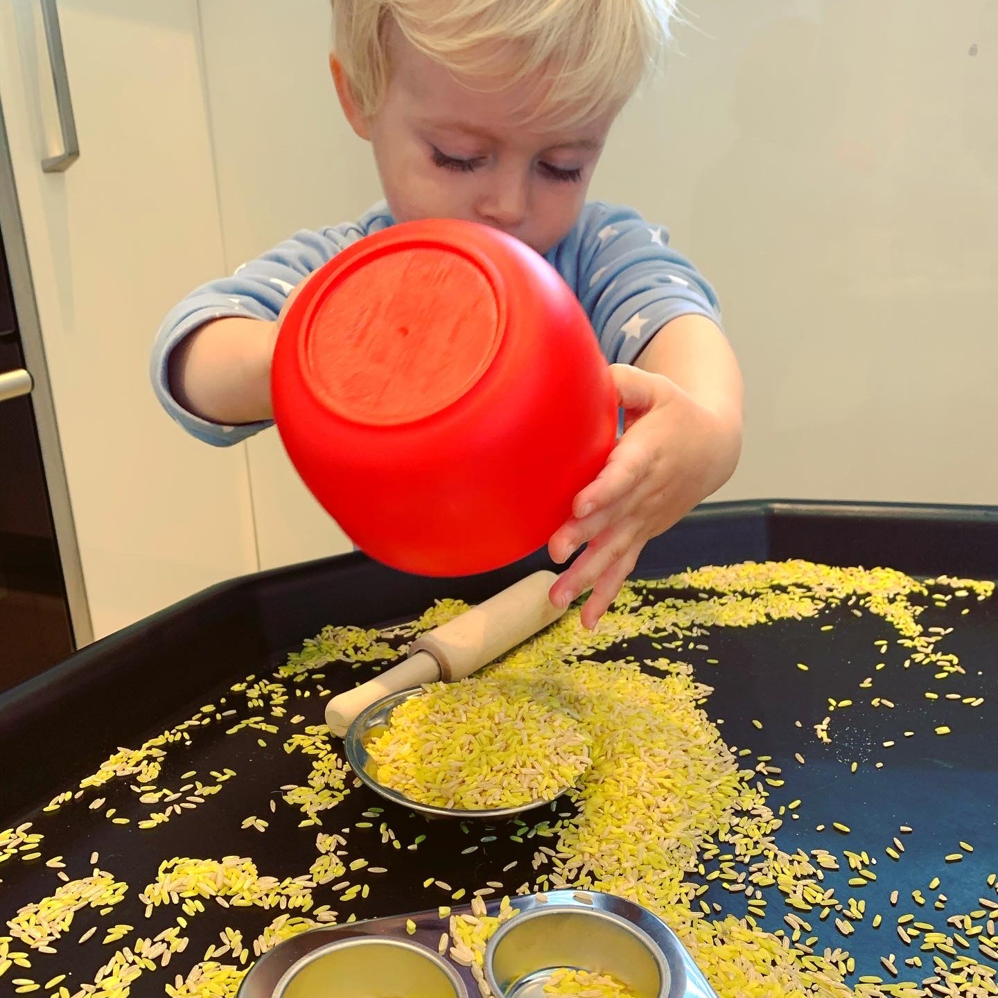 Harry LOVES this activity! He has spent A LOT of time playing with rice in multiple ways. The images attached to this post have been taken on just two occasions where Harry has enjoyed using rice- one with trucks and diggers and one with his baking set. He thoroughly enjoys filling and emptying different containers, pouring between vessels and listening to the noise the rice makes when it’s dropped on different material surfaces.