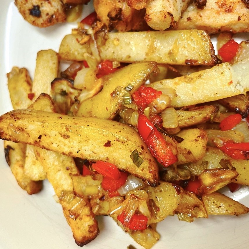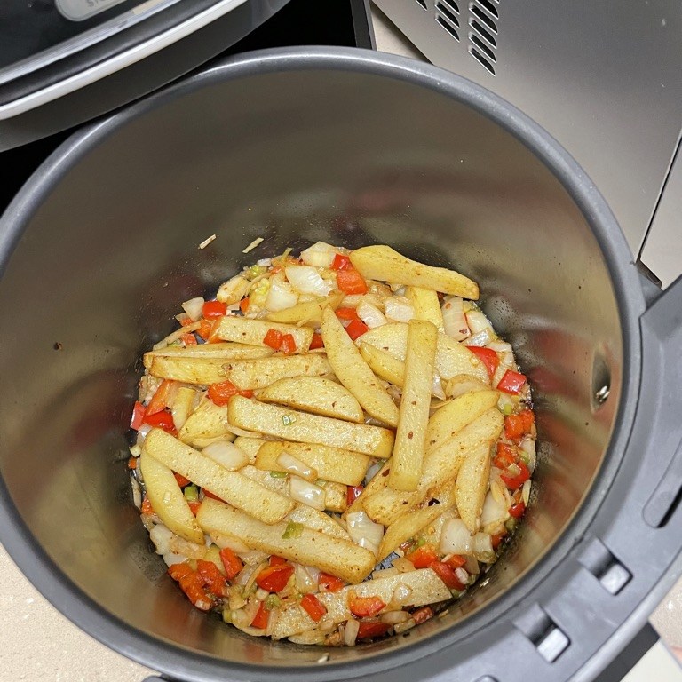 - If using a deep fat fryer, fry your chips as normal before adding them to your fried veg and spices.