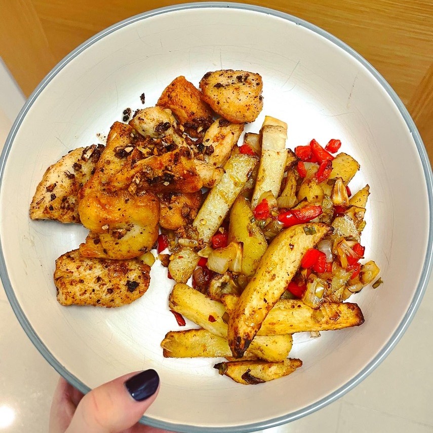 These homemade Salt and Pepper chips are SO GOOD! You may be thinking, but what makes them ‘healthier’ though Shelley? These little beauties were made in our new air fryer! So why does this make them healthier? Air frying is healthier than frying in oil because it cuts calories by 70% to 80% and uses a lot less fat. It is also suggested that this cooking method can also cut down on some of the other harmful effects of oil frying.